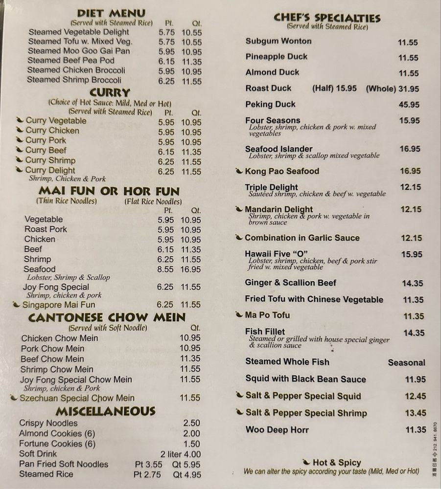 One of the highlights of the menu is the highly praised Joy Fong Fried Rice, alongside fan favorites like Crab Rangoons and Hot and Sour Soup. Locals often rave about the Salt Pepper Squid and generous portion sizes, making each meal satisfying and delicious.